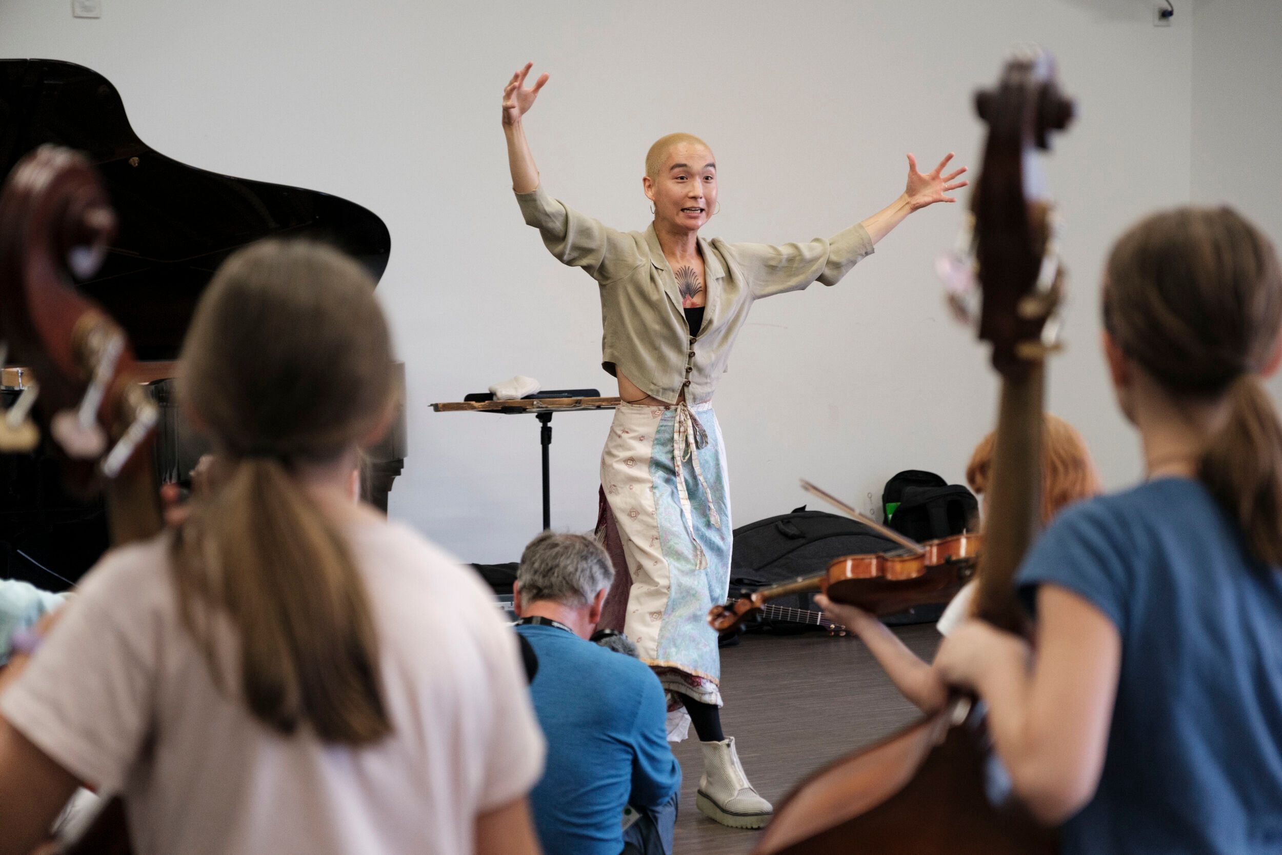 Schon bei der ersten Ausgabe von The Prequel kam es 2021 zu einer Kooperation mit den „Orchesterklassen“ der Musikschule. Und auch die Aufführung der Komposition „dance until you know what it is“ von yuniya edi kwon für das kommende The Festival 2025 basiert auf einer langfristigen Zusammenarbeit: In einem Improvisationsworkshop haben yuniya edi kwon und Shahzad Ismaily das Schüler:innen-Ensemble des Otto-Hahn-Gymnasiums schon während The Prequel 2024 kennengelernt. Auf Basis dieser freundlichen Begegnung und in intensivem Austausch zwischen dem Ensemble und den Signature Artists entsteht nun eine Performance, die gleichermaßen auf komponierte und improvisierte Teile aufbaut.