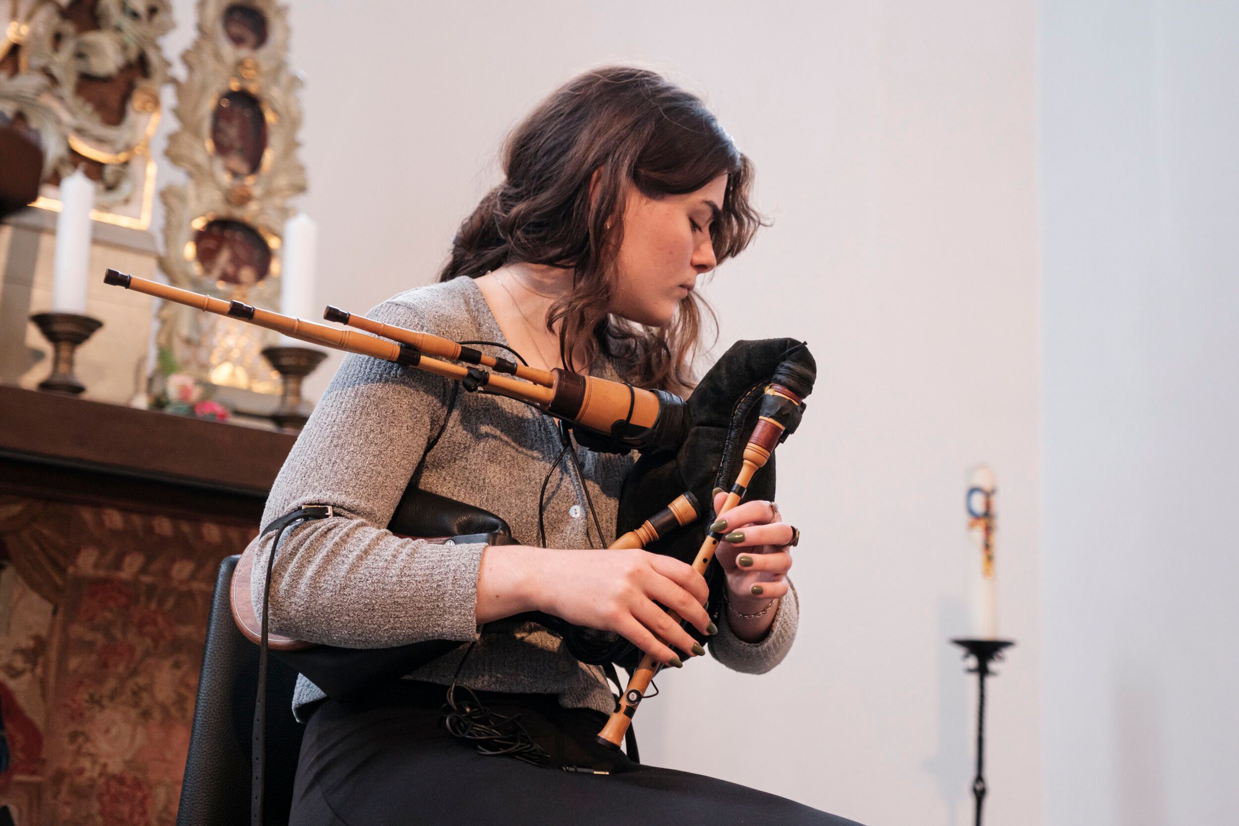 Solche Personifikationen der Jahreszeiten gibt es in der gälischen Folklore zuhauf, wie Chaimbeul anmerkt. „Es ist, als ob man eine Art menschlichen Vergleich zu etwas herstellt, das sich außerhalb menschlicher Kontrolle befindet.“ Der dem innewohnende Dualismus von Licht und seiner Abwesenheit wird auch die Visuals beeinflussen, die Chaimbeul als „abstrakt“ bezeichnet. „Sie reagieren auf das, was passiert – die Bewegung meiner Finger, die Schallwellen, Mollys Bewegungen“, sagt sie. „Zugleich wird eine dunkle, abgeschottete Welt geschaffen.”